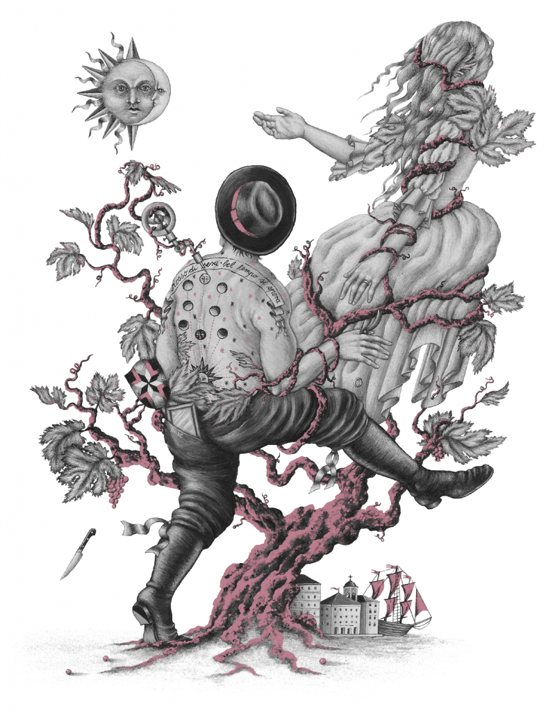 A winemaker with a very bad memory went to a big city by the sea, where he had everything he knew about grapes, the moon and the fertility of the soil tattoed on his back. As time passed by, he eventually got married, out of love of course â but his love was only for the grapevine. He cherished the evenings in which his wife read to him from his scarred back, again and again. But his fate was to be written in different words. One day, when he was returning from another hard working day in the vineyard, a merchant crossed his way. This merchant sold our winemaker a small mirror which he said would help him read from his back. This meant he didnât have to provide for another hungry mouth, so he promptly threw his wife out of his house and out of his life. From that day on, he never looked at another woman. People say you can still see him on a hot sunny day, working in his vineyard dressed only in trousers, boots and a hat, filled with bursting love for his grapevine. Even from afar, you can get blinded by his pocket mirror, which reflects his unmatched passion. We are proud our wine Pinela heralds his ineffaceable sign.
